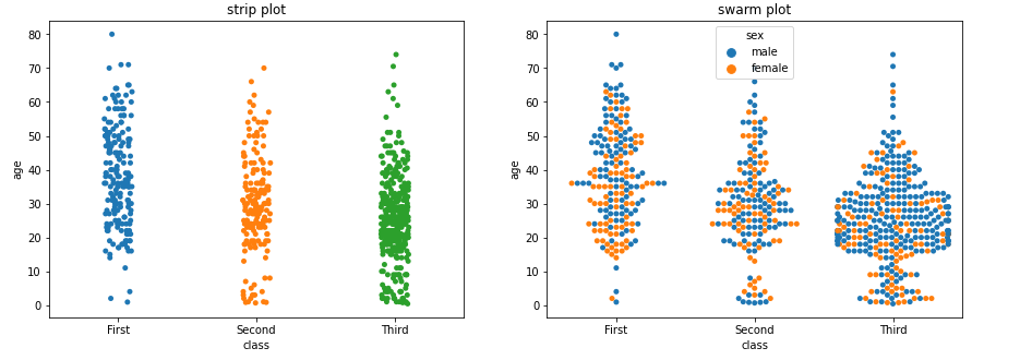 swarmplot 함수 : 데이터의 분산까지 고려하여 데이터 포인트가 서로 중복되지 않도록 시각화. 즉, 데이터가 퍼져 있는 정도를 입체적으로 파악 가능